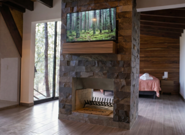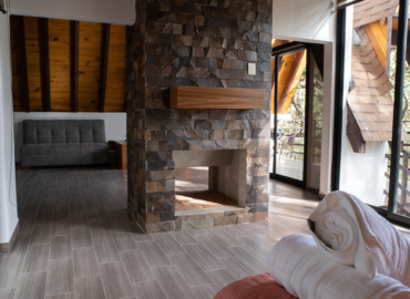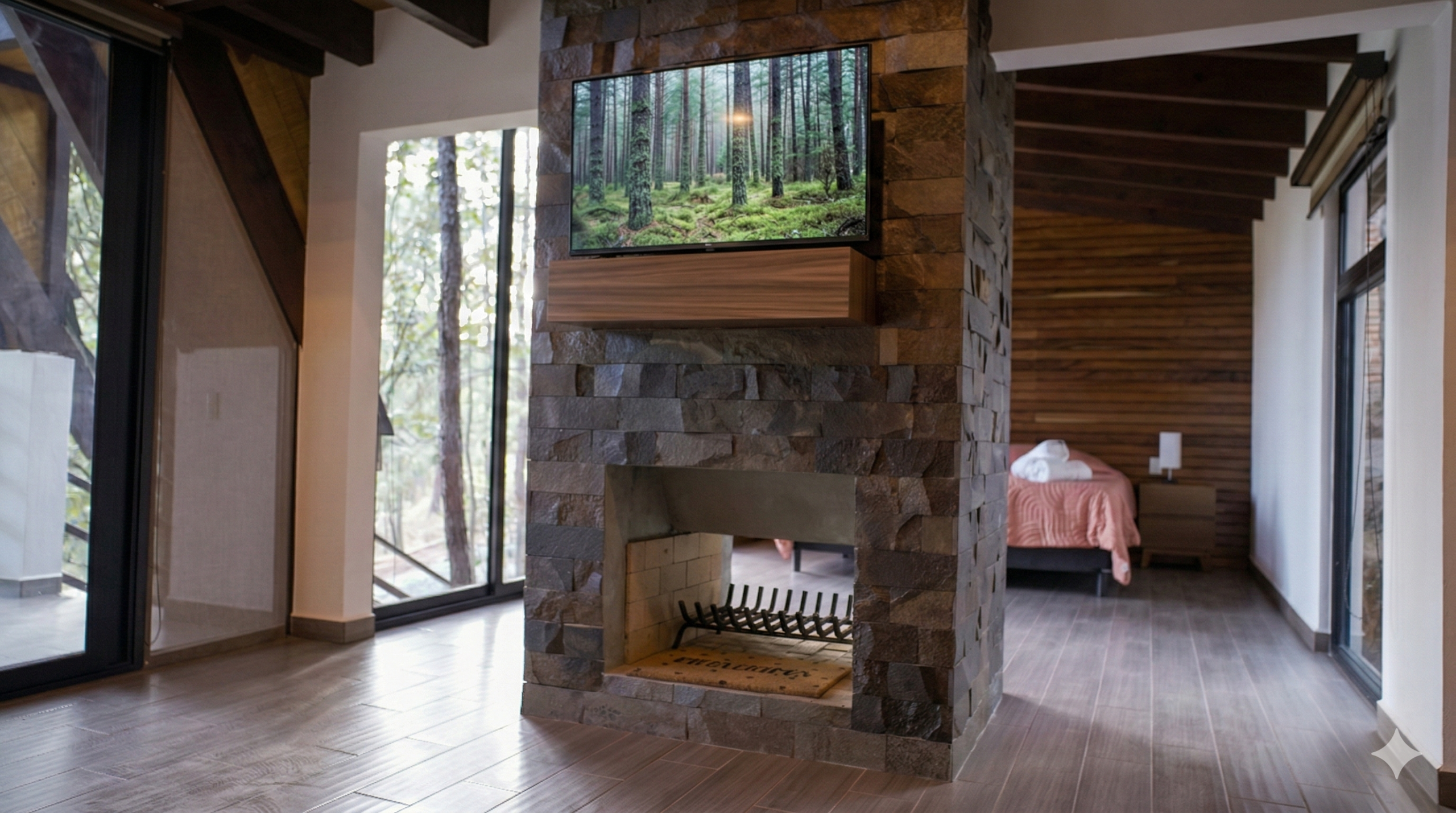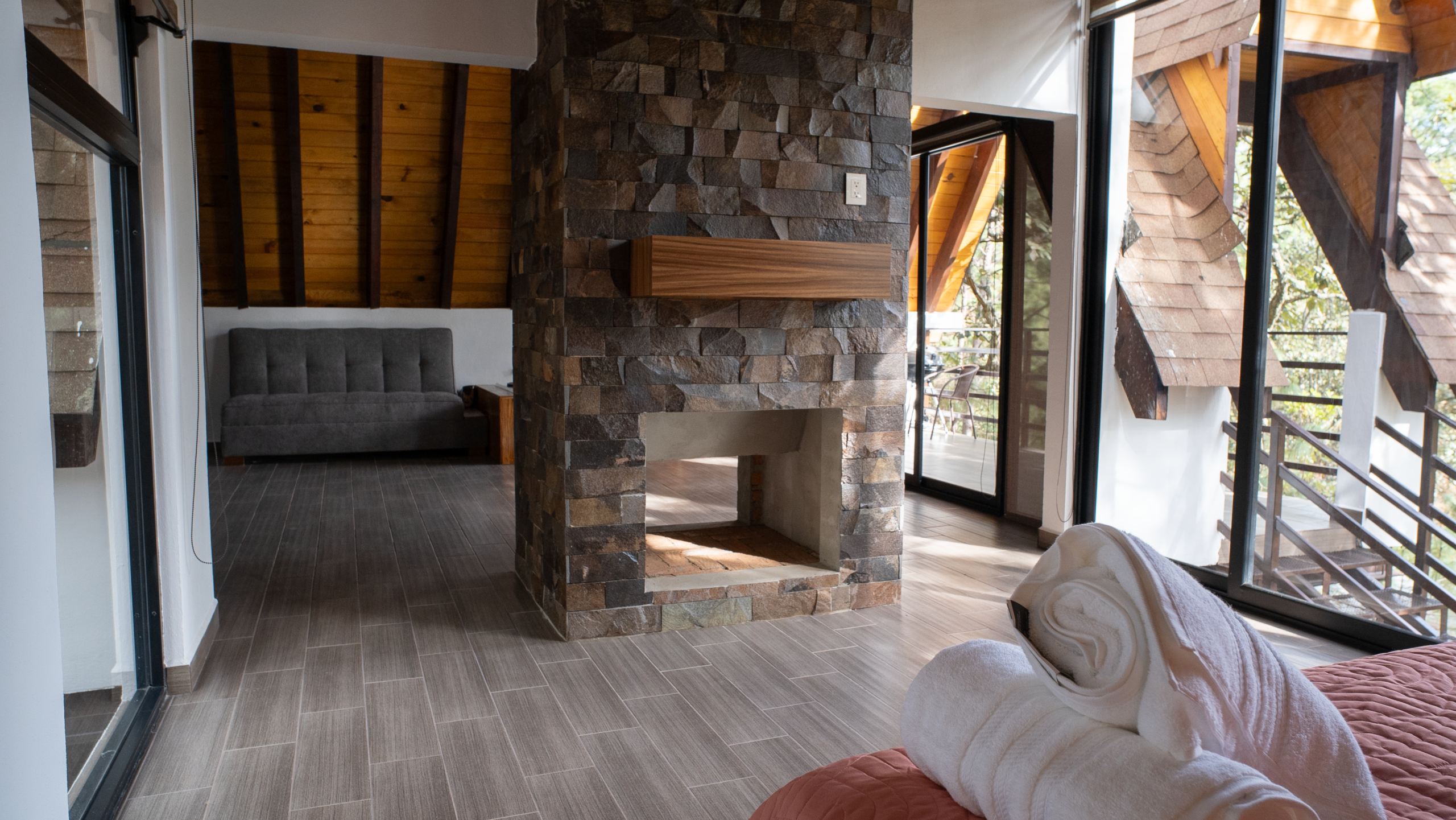 El protagonista indiscutible es el centro de la cabaña: una chimenea de leña tradicional y, justo enfrente, un jacuzzi interior. Es el lugar perfecto para relajarte con el fuego prendido, poner su serie favorita en la pantalla de 55″ (sí, hay Wi-Fi) y disfrutar de la vista increíble hacia la Sierra del Tigre sin pasar frío.