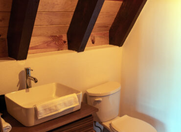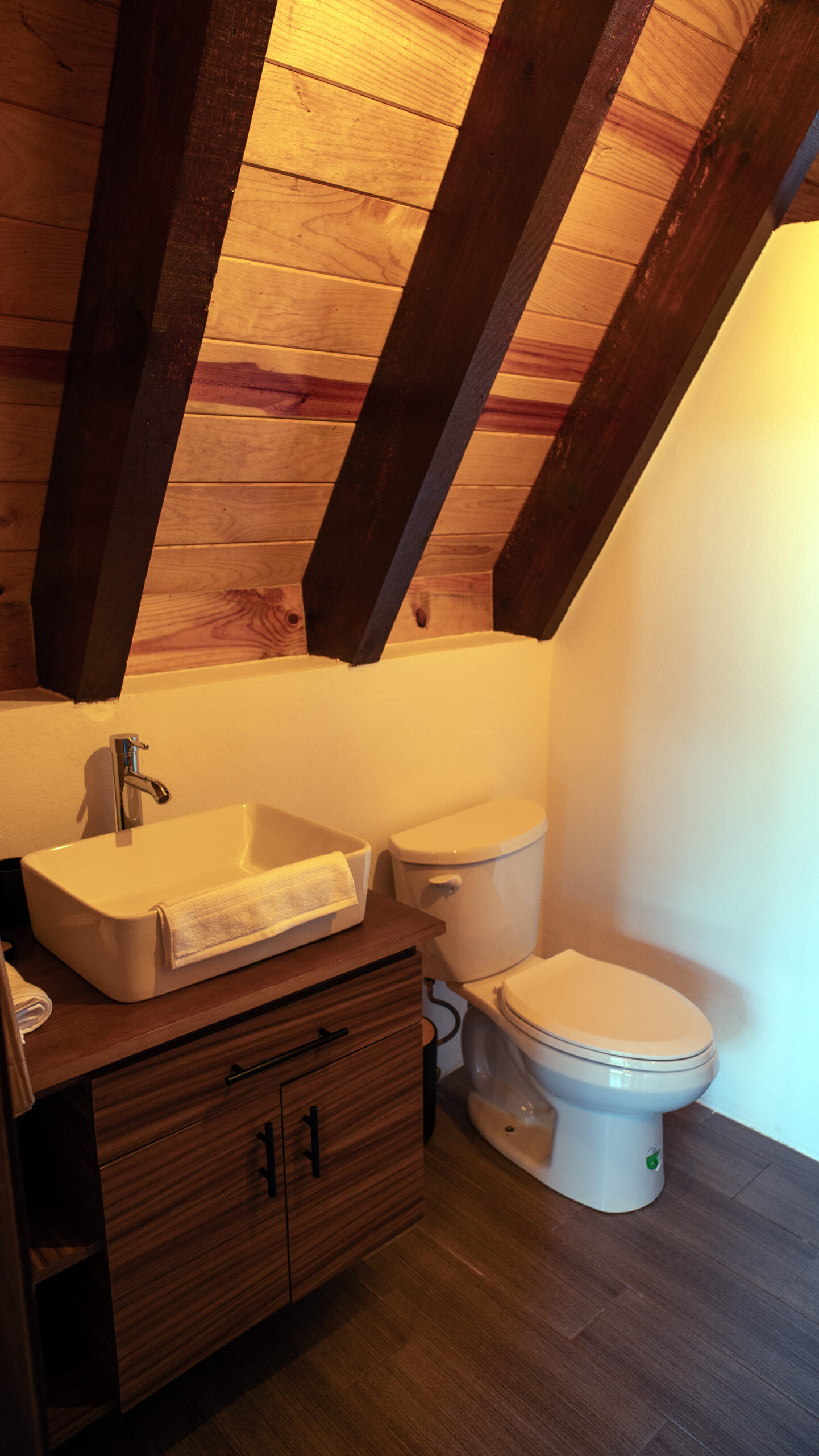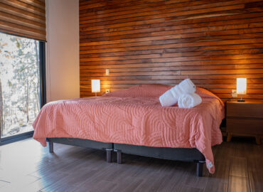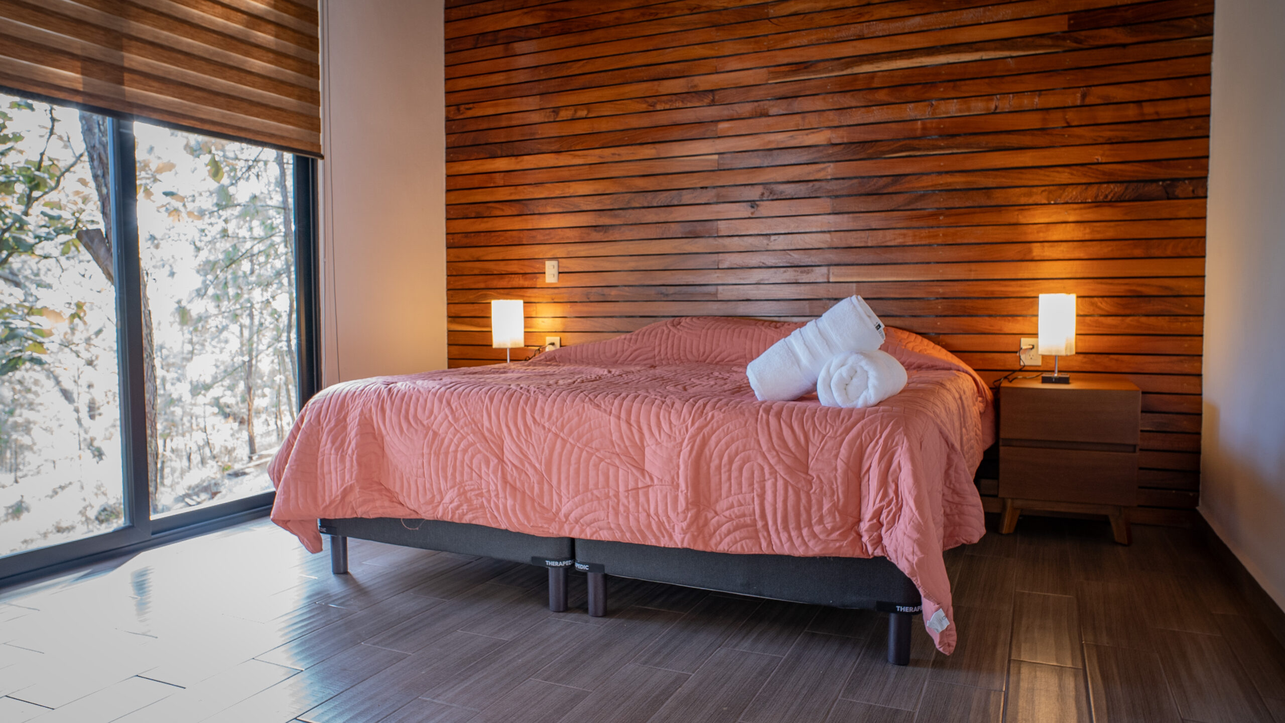 Descanso real: Te espera una cama King Size junto a un ventanal gigante. Literalmente, vas a despertar viendo la copa de los árboles y respirando aire fresco.