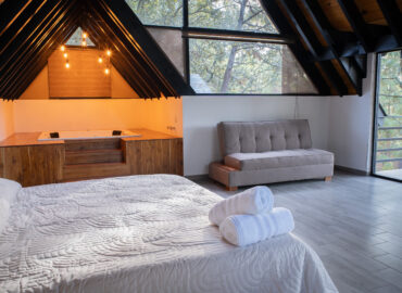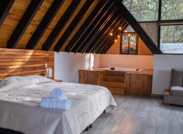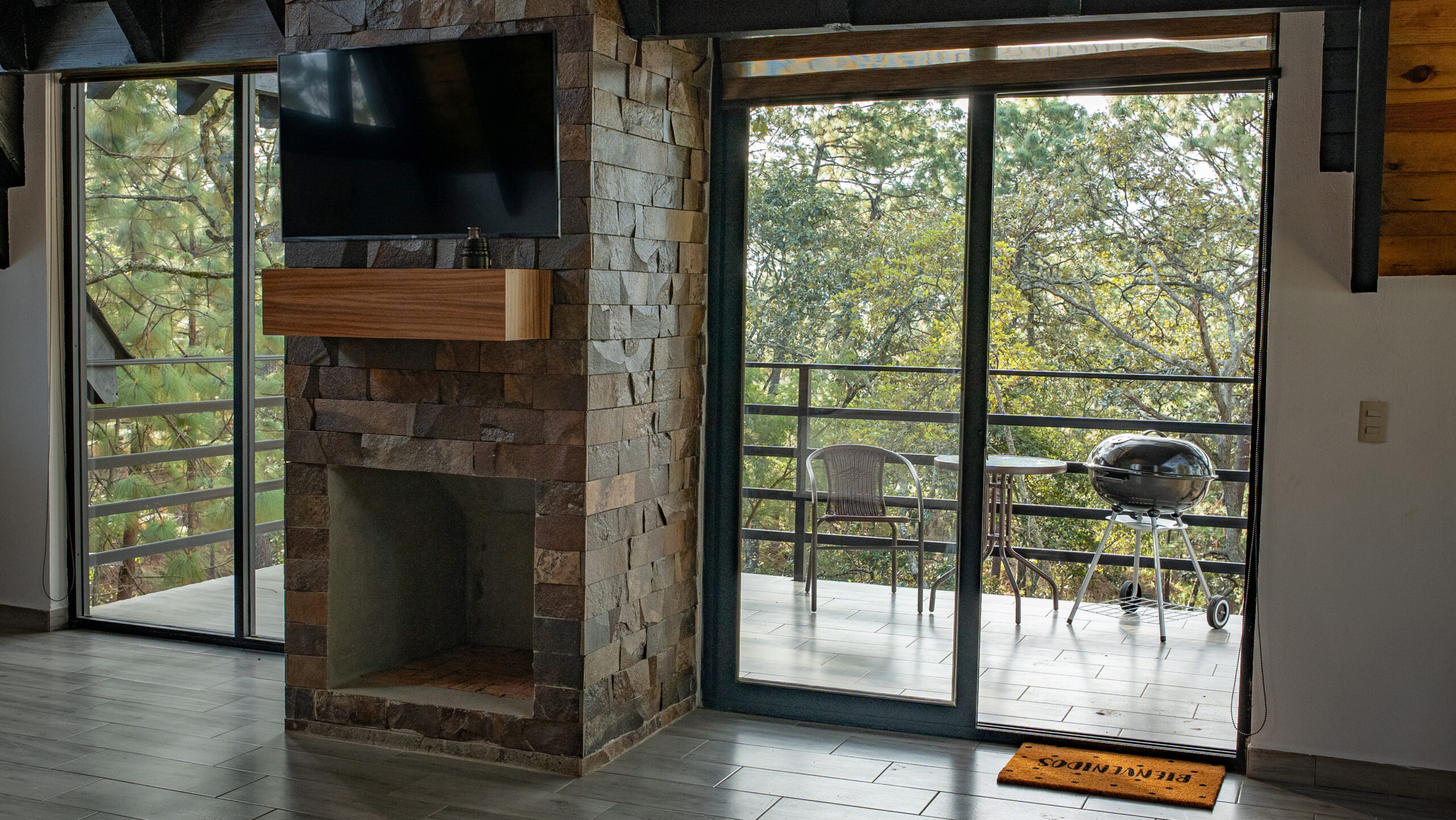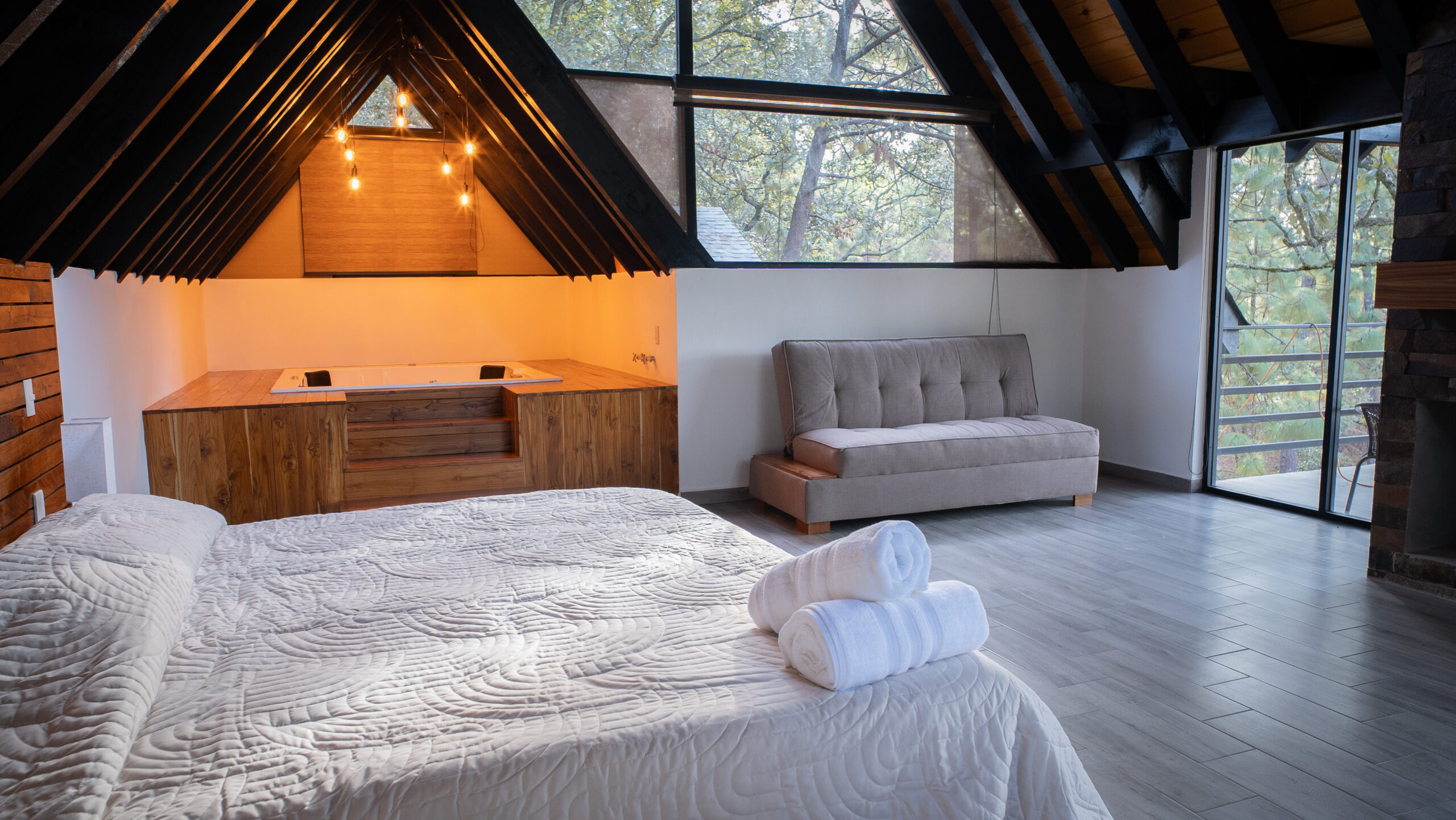 El verdadero protagonista de este espacio es su increíble jacuzzi interior. Imagínate esto: ustedes dos en el agua caliente, el sonido de la chimenea de leña crepitando justo enfrente, su serie favorita en la pantalla de 55″ (sí, hay Wi-Fi) y una vista panorámica espectacular a la Sierra del Tigre de fondo. Literalmente, es el spot perfecto para no salir del agua en toda la tarde y disfrutar del bosque sin pasar una gota de frío.