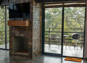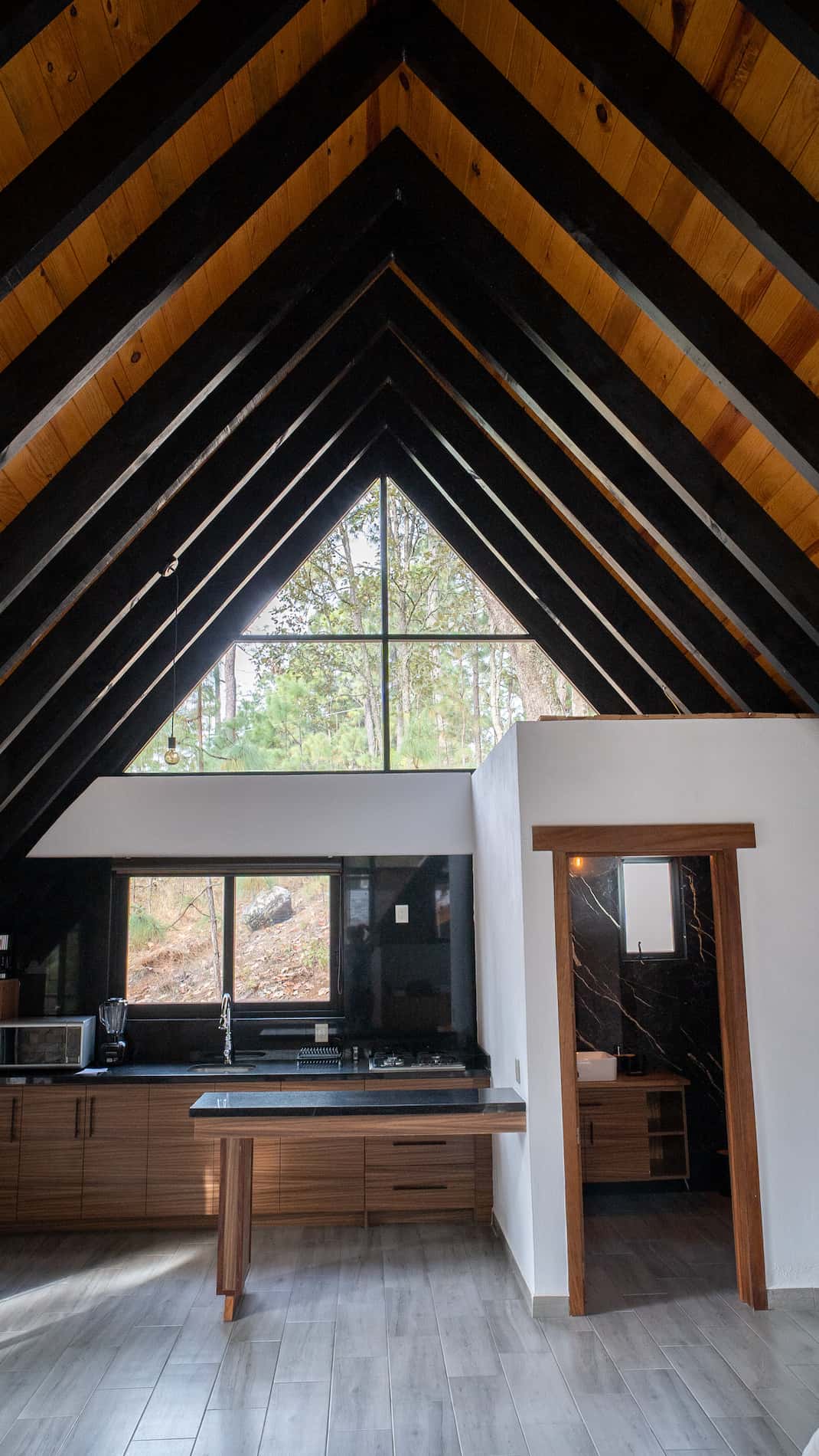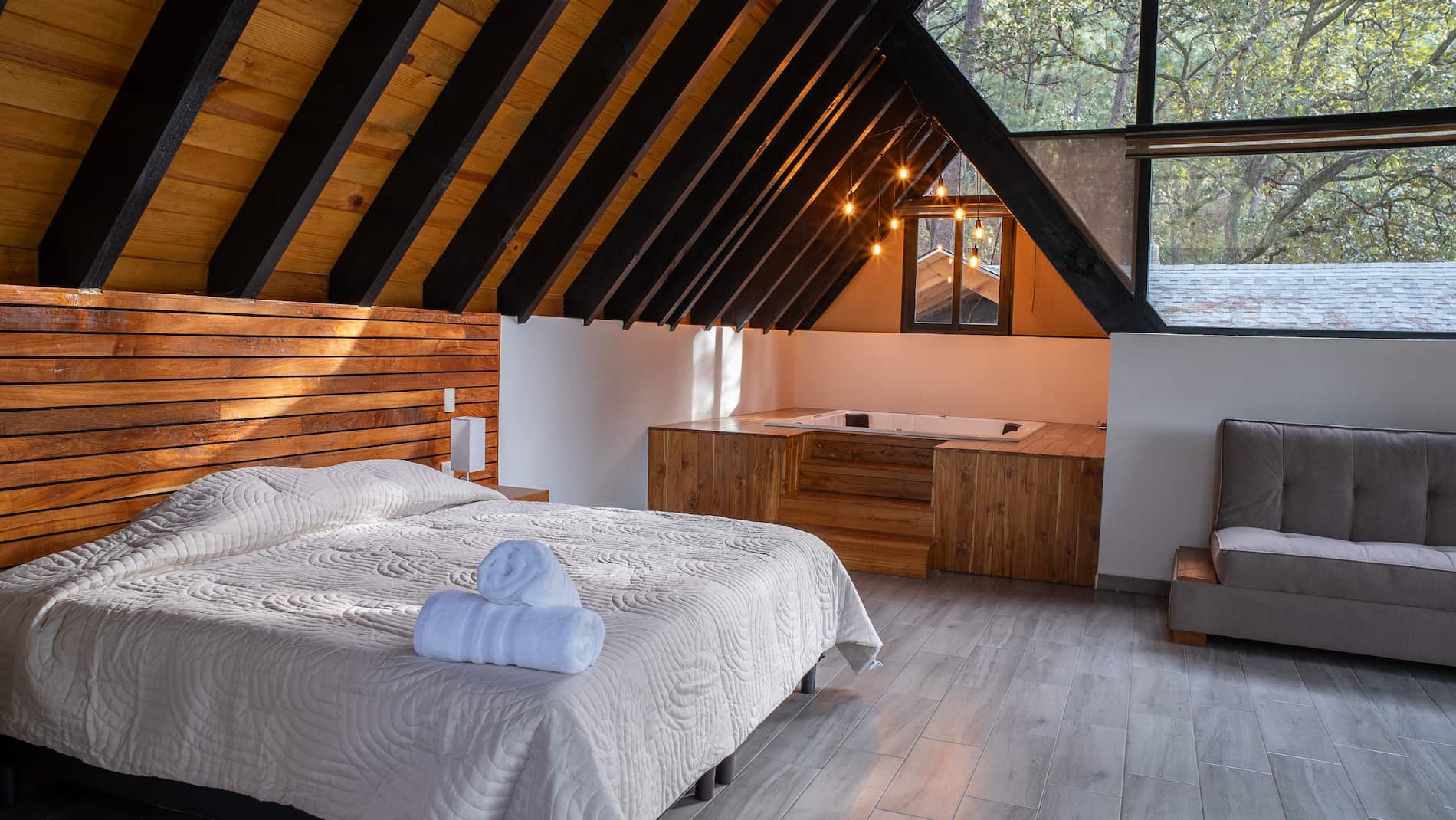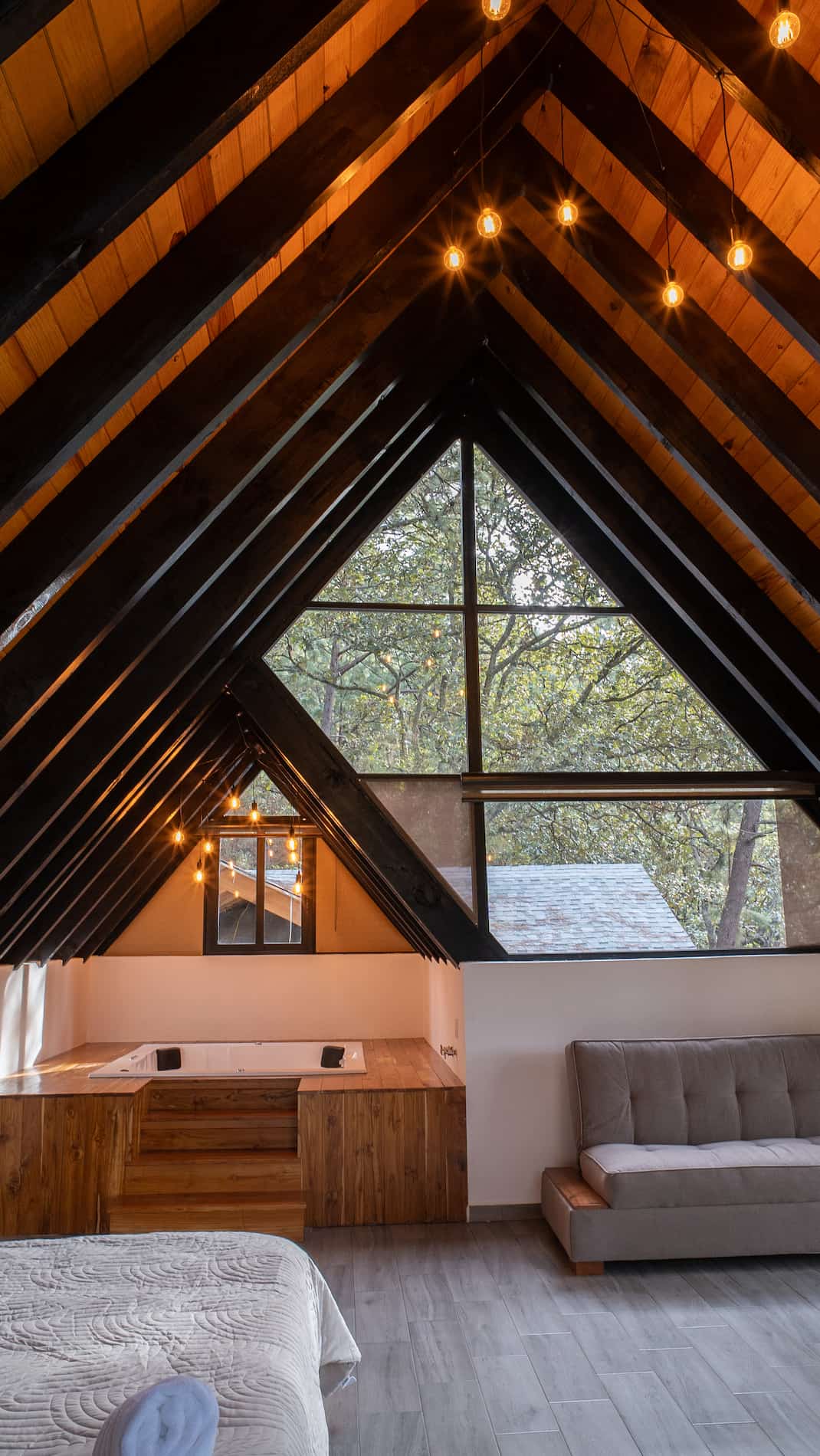 El verdadero protagonista de este espacio es su increíble jacuzzi interior. Imagínate esto: ustedes dos en el agua caliente, el sonido de la chimenea de leña crepitando justo enfrente, su serie favorita en la pantalla de 55″ (sí, hay Wi-Fi) y una vista panorámica espectacular a la Sierra del Tigre de fondo. Literalmente, es el spot perfecto para no salir del agua en toda la tarde y disfrutar del bosque sin pasar una gota de frío.